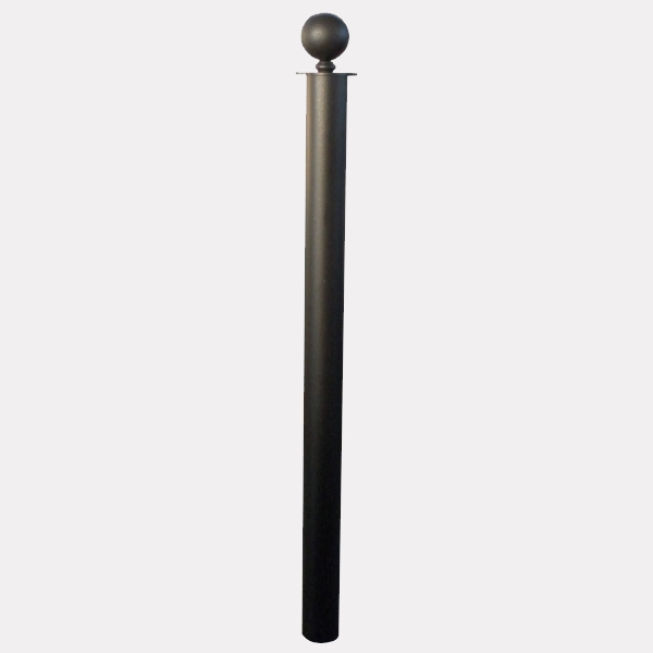 Dissuasore Berlino da inghisare con anelli, realizzato in tubolare di acciaio Ø80 mm con sovrastante borchia e sfera decorativa in acciaio forgiato. Il fissaggio al suolo avviene direttamente inghisato al suolo. È fornito di piastrina con fori per il fissaggio di gancio per catena. Le parti in acciaio sono zincate secondo norme UNI e verniciate a polveri poliestere termoindurenti nelle diverse colorazioni RAL.