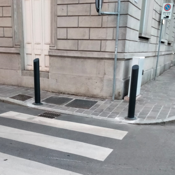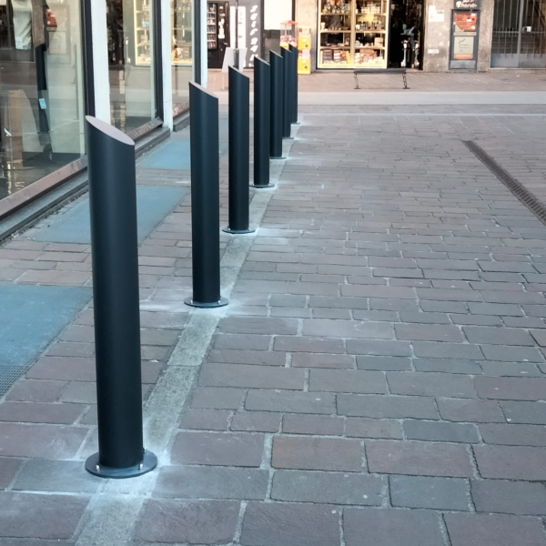 Dissuasore Emirates Ø 21,9 cm in acciaio zincato e verniciato di altezza 120 cm realizzato in tubolare chiuso all’estremità superiore da una lamiera in acciaio sagomata al laser e saldata al tubolare. Il dissuasore è fornito con piastra base con fori per il fissaggio al suolo con tasselli. La parte superiore è inclinata.