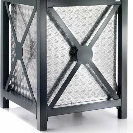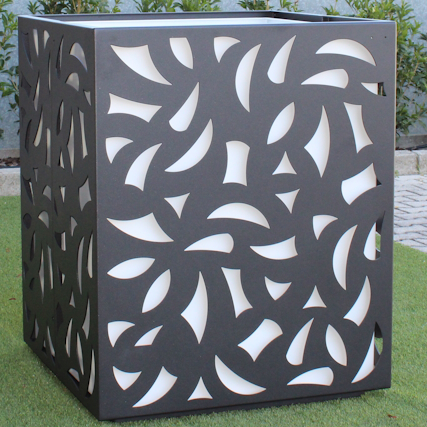 Fioriera quadrata con decori incisi al laser realizzata in acciaio zincato e verniciato.