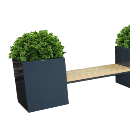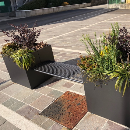 Fioriera con seduta in legno, realizzata in acciaio zincato e verniciato.