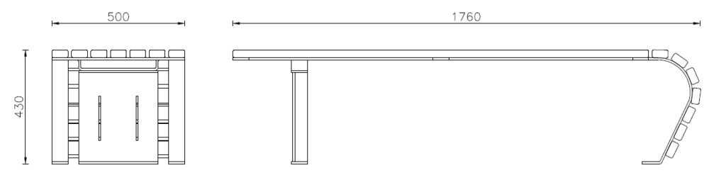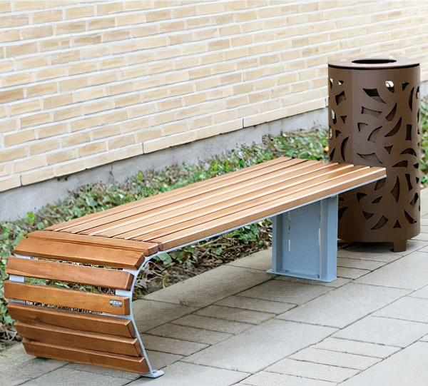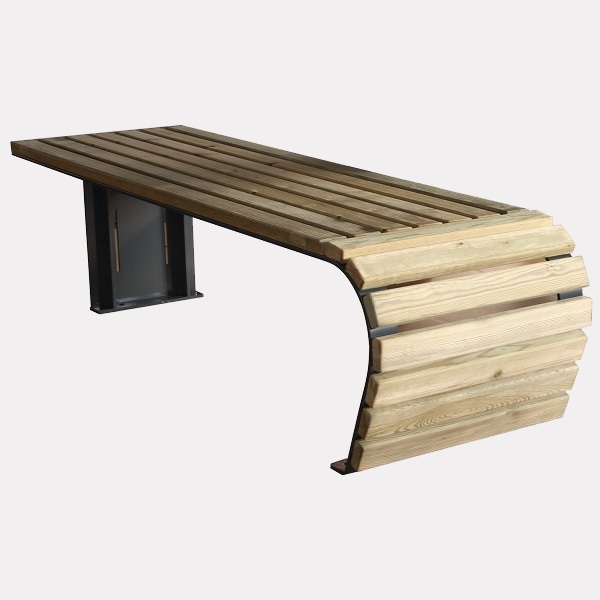 Panchina Contoure con legno di pino senza schienale. Struttura composta da due piatti di acciaio calandrato, fissati da un lato su una piastra rinforzata da due piatti, sulla quale è fissata una piastra base con fori per il tassellamento a terra. Seduta realizzata da doghe in legno di pino nordico impregnate in autoclave in conformità alle norme DIN 68800-3 per preservare il legno contro l’attacco di funghi, muffe e agenti atmosferici. Tutte le parti metalliche sono zincate e verniciate a polveri poliestere termoindurenti. La viteria è in acciaio inox. Elegante e di design moderno, si può inserire sia in contesti esterni di pregio che spazi di grande afflusso centri commerciali, ospedali).