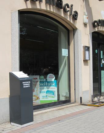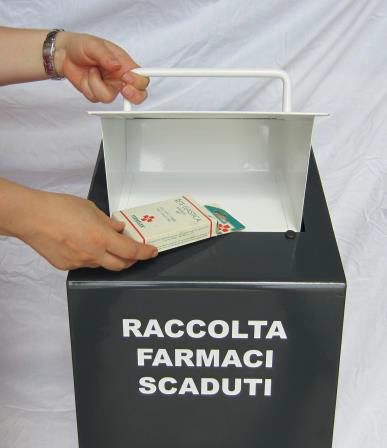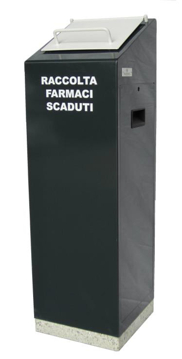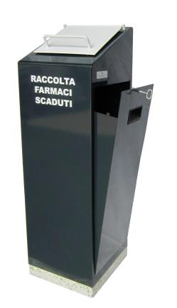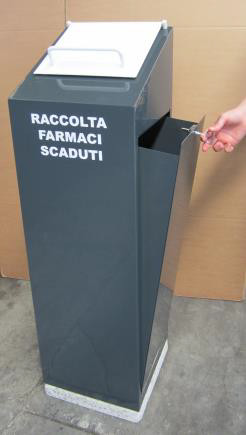 | Corpo | Interamente chiuso con serratura, è dotato di una speciale bocca per l'immissione dei farmaci scaduti tale da non consentire la rimozione del materiale già stoccato. Di facile impiego dispone per lo svuotamento di una comoda portella laterale a cui risulta incorporato il contenitore di raccolta |